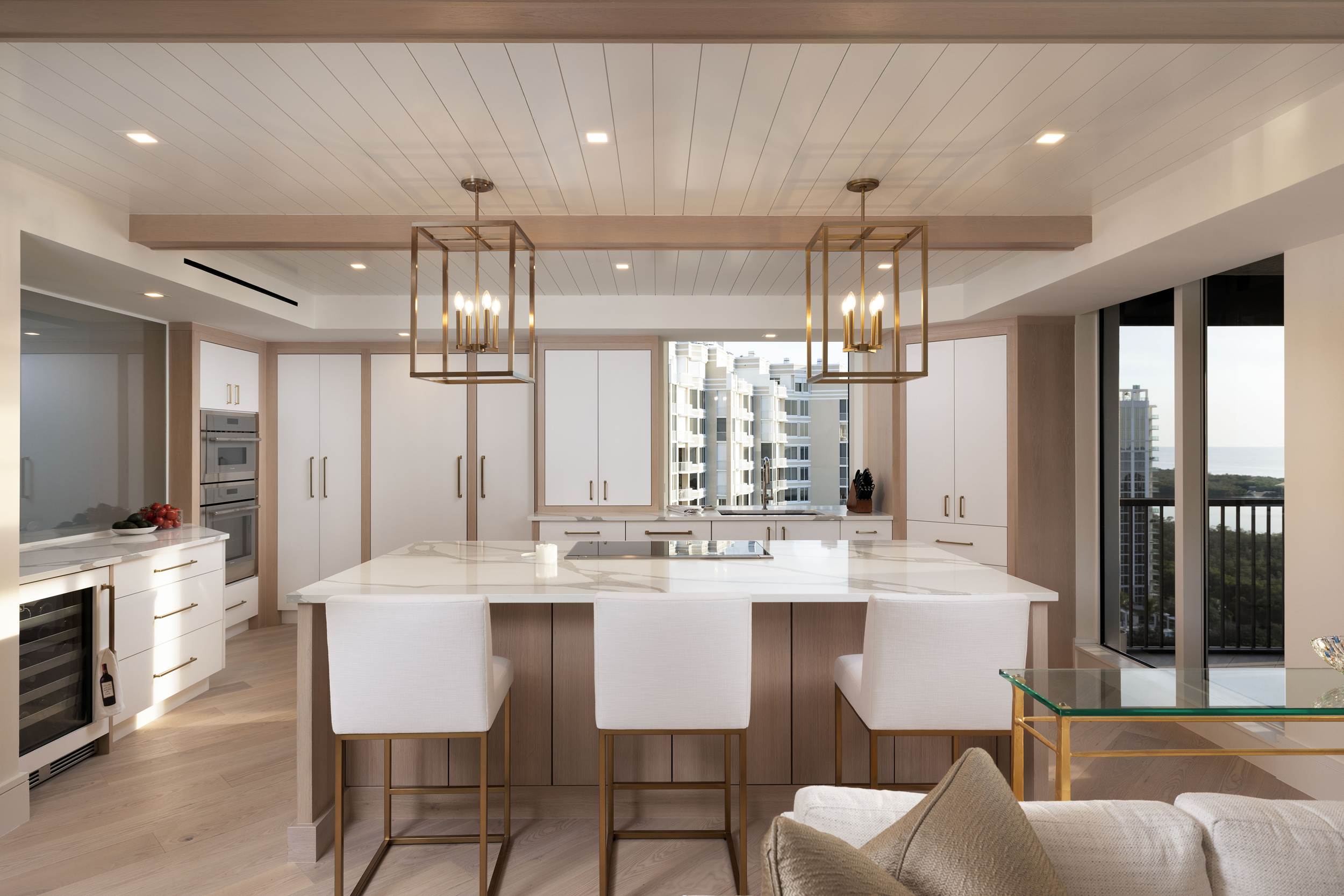 As you move into the heart of the home, the transition between contemporary lines and classic details is seamless. Overhead, custom tongue-and-groove ceilings and refined trim work add a layer of texture that keeps the vast views from feeling sterile. In the gourmet kitchen, the aesthetic is both clean and tactile; stained oak meets crisp white cabinetry, all punctuated by warm gold hardware and the polished elegance of Cambria countertops. It is a space built for a serious chef, featuring a suite of Thermador appliances—including panel-ready refrigerator and freezer columns and an under-counter wine station—that disappear into the millwork to maintain the room’s visual calm.